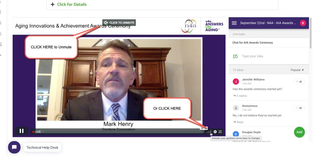 Depending on your browser or system/computer setup, an embedded video MAY start in a “Muted” state. See below on how to ensure the video is not muted.